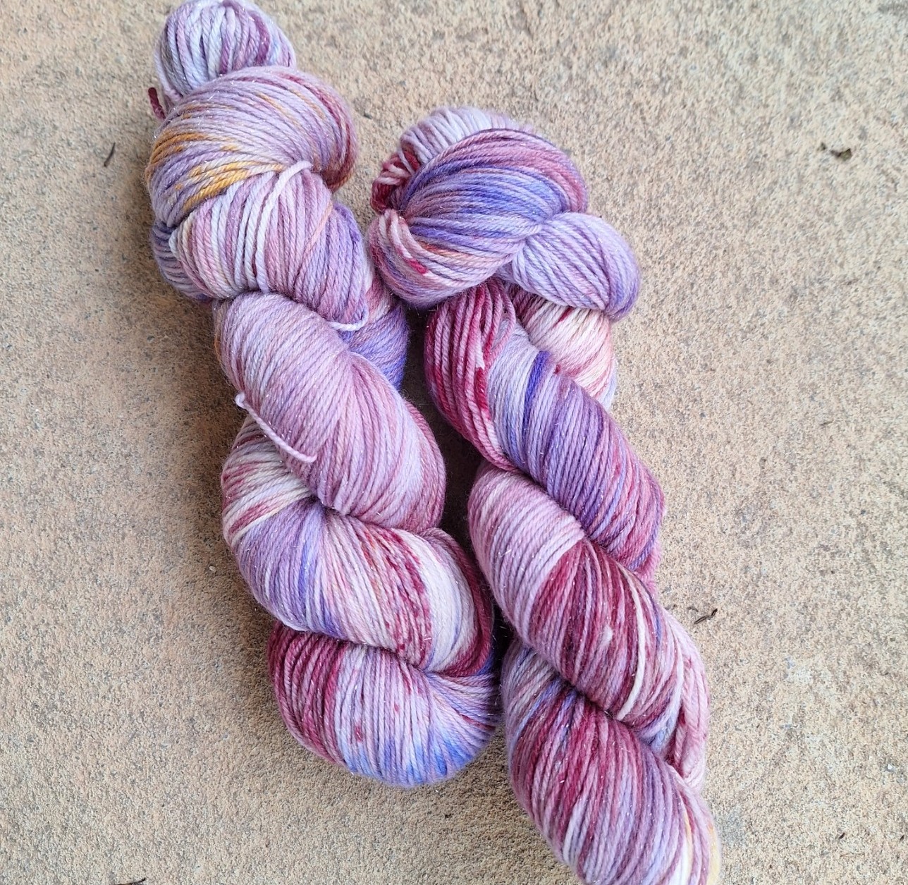 Hand dyed Sock yarn in shades of grey, purple, pinks with light oranges and orange speckles.