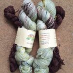 Hand dyed a pale Olive green with speckles of Chocolate brown, golden yellow and dark olive greens. The 20gm nini skein is a dark chocolate brown .