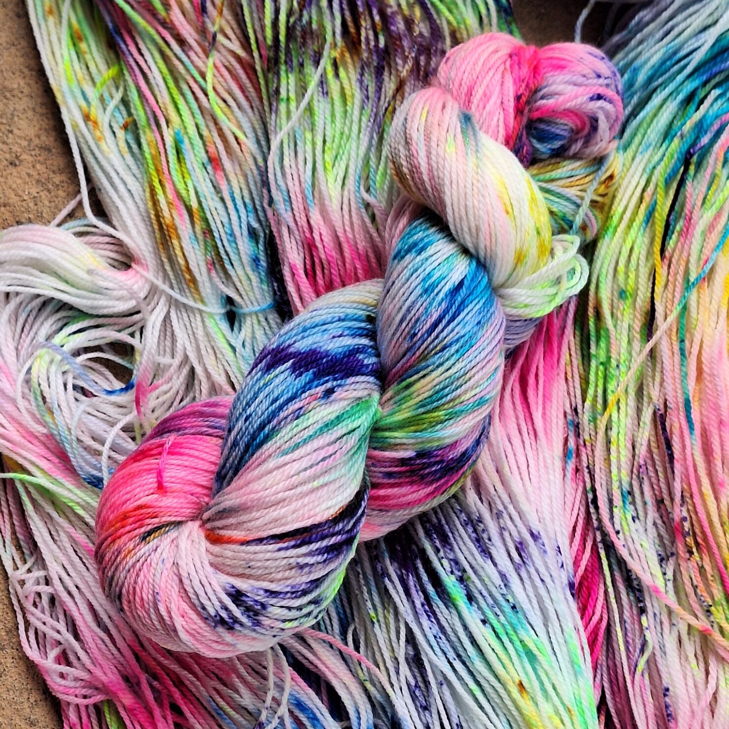 Hand dyed Sock yarn with Turquoise, Cyclamen pink, Bright Yellow and chartreuse greens. Golden yellow speckles with a smattering of chartreuse speckles.
