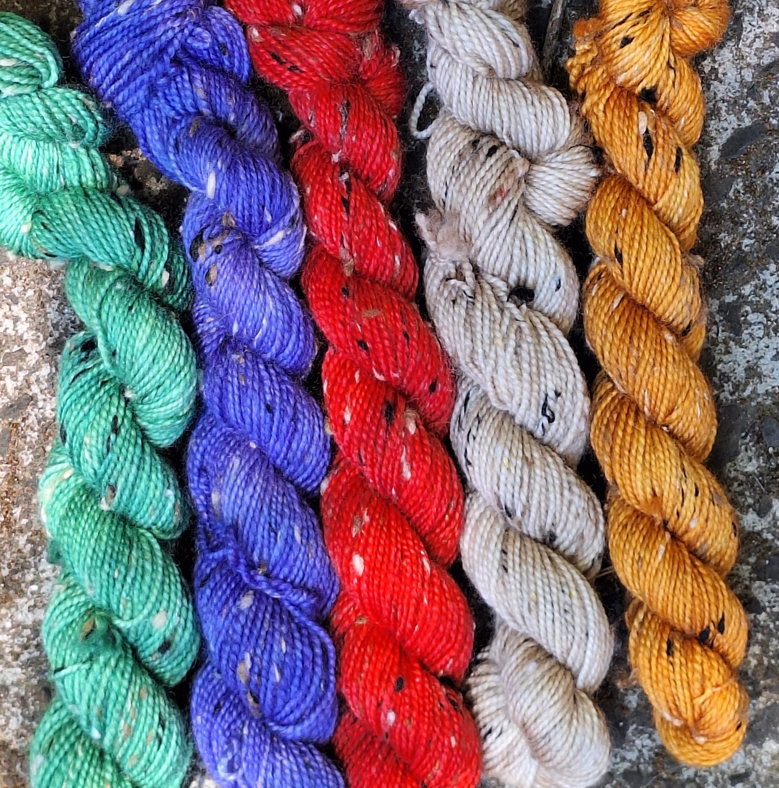 Hand dyed mini Skeins of Donegal Tweed 4ply yarn 5 x 20gm in shades that are decidedly Christmassy.